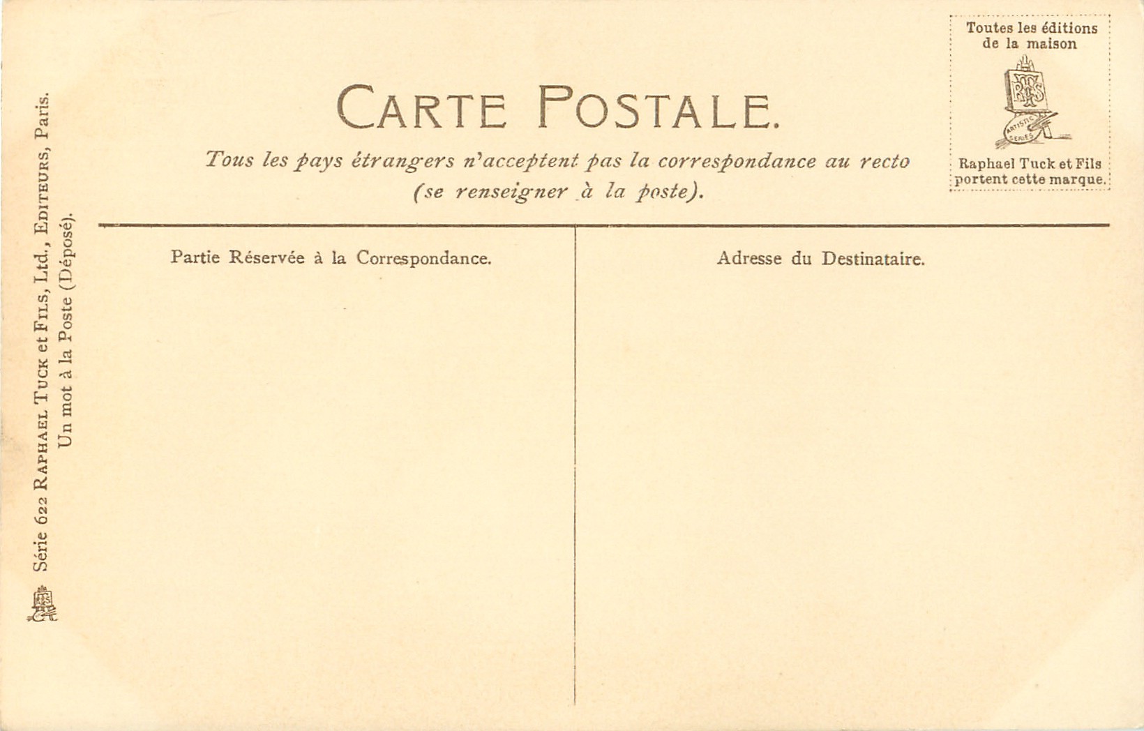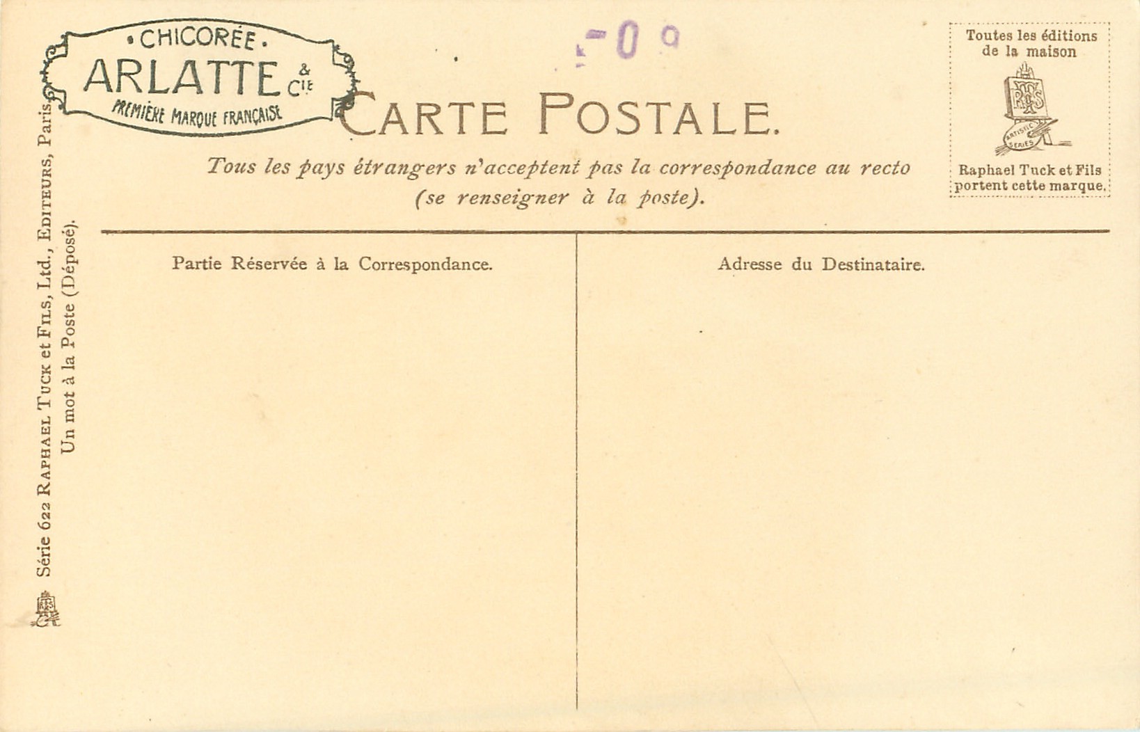UN MOT A LA POSTE (DEPOSE), come with CHICOREE ARLATTE & CIE advert, same image English back ART 6746, German back KUNSTLER POSTKARTE 6747, listed in 1908/1909 Catalogue