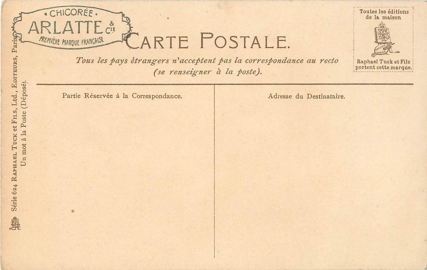 UN MOT A LA POSTE (DEPOSE), same image English back ART 6750, come with CHICOREE ARLATTE & CIE PREMIUM MARQUE FRANCAIS advert. on back