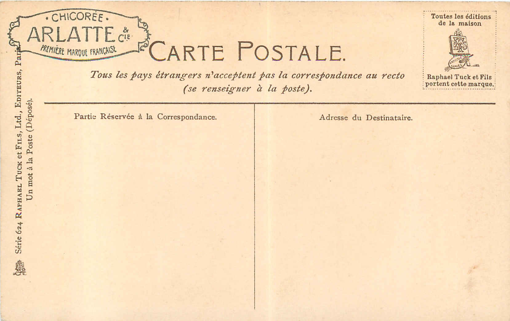 UN MOT A LA POSTE (DEPOSE), same image English back ART 6750, come with CHICOREE ARLATTE & CIE PREMIUM MARQUE FRANCAIS advert. on back