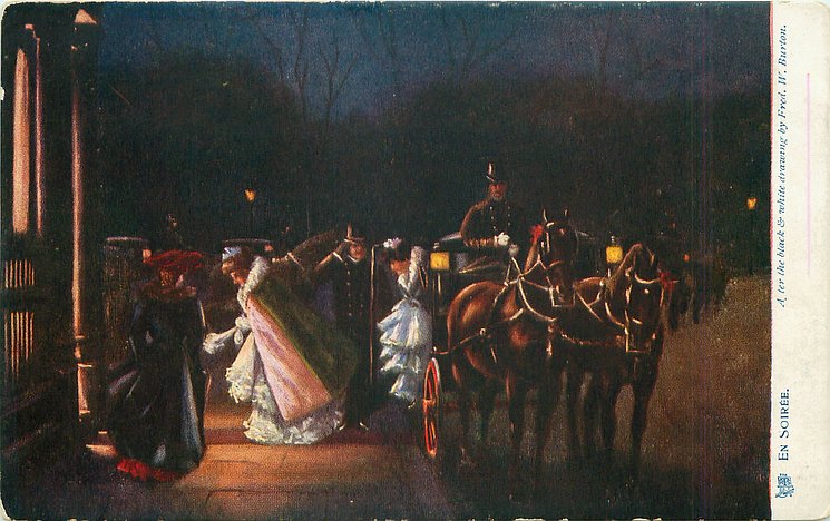 AFTER THE BLACK & WHITE DRAWING BY FRED. BURTON, same image, English back OILETTE 1543 RETURN FROM THE OPERA