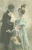 couple in old style elegant dress, man left faces & looks at woman who looks into his eyes, they hold hands