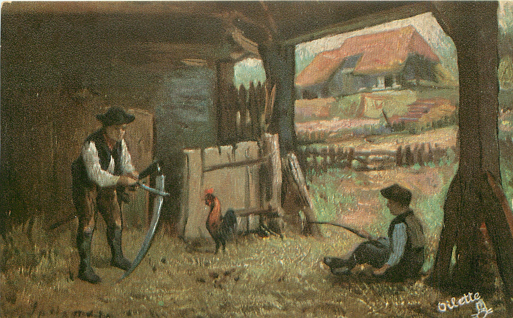 stable scene, man stands left sharpening scythe, boy sits in straw right