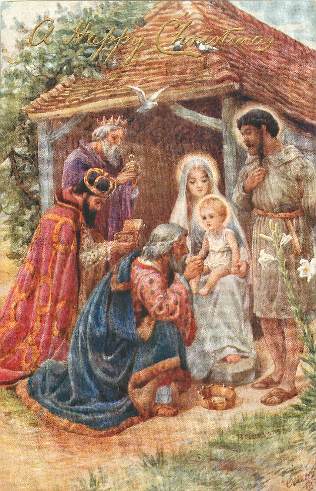 A HAPPY CHRISTMAS Three Kings adore Jesus on Mary's lap in front of stable, Joseph right