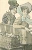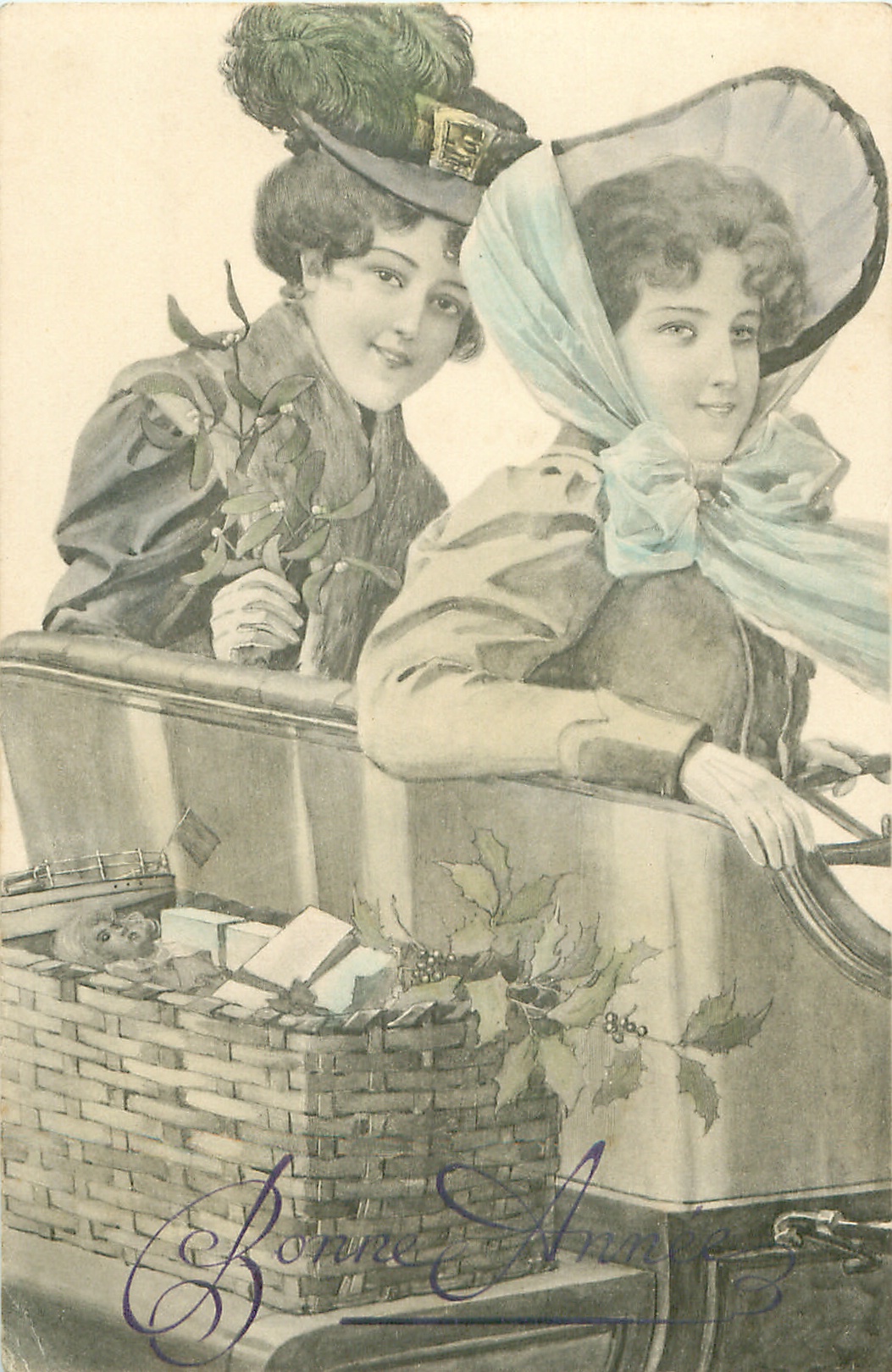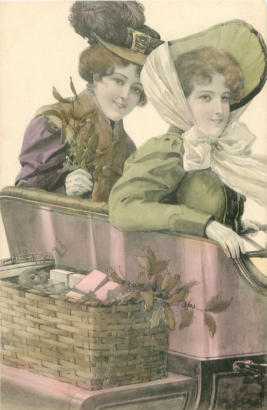 two pretty girls drive antique car right, they turn to look left/front, presents in basket on seat behind them
