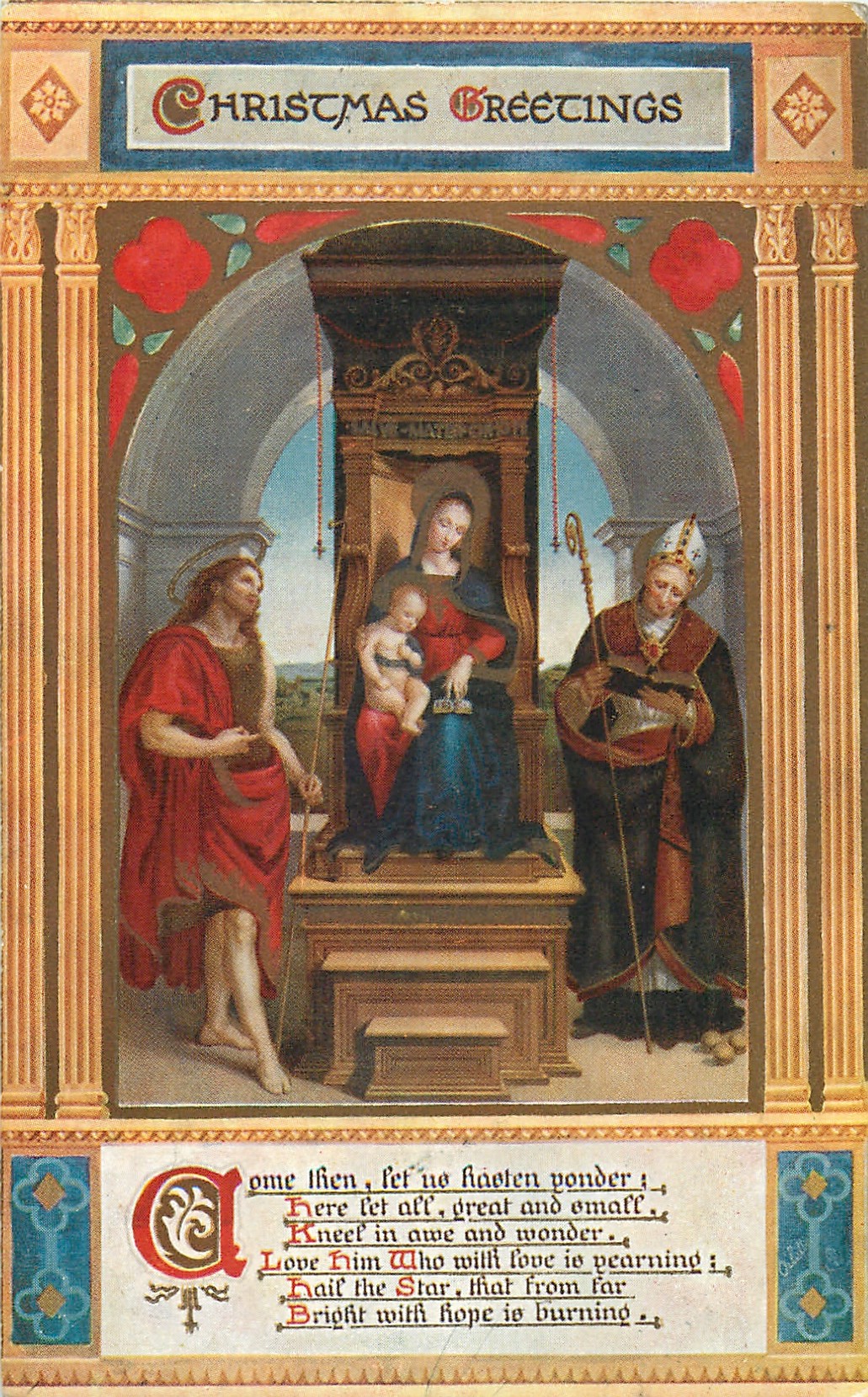 verse:- COME THEN, LET US HASTEN YONDER; HERE LET ALL, GREAT AND SMALL, KNEEL IN AWE AND WONDER. LOVE HIM WHO WITH LOVE IS//HOPE IS BURNING. - Ansidei Madonna, John the Baptist, Saint Nicholas