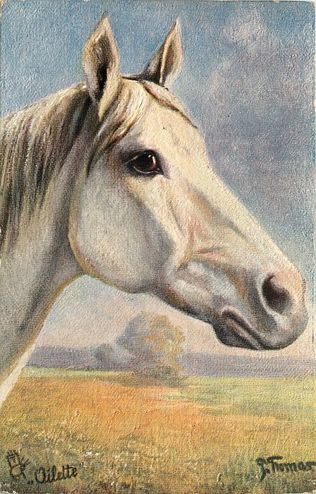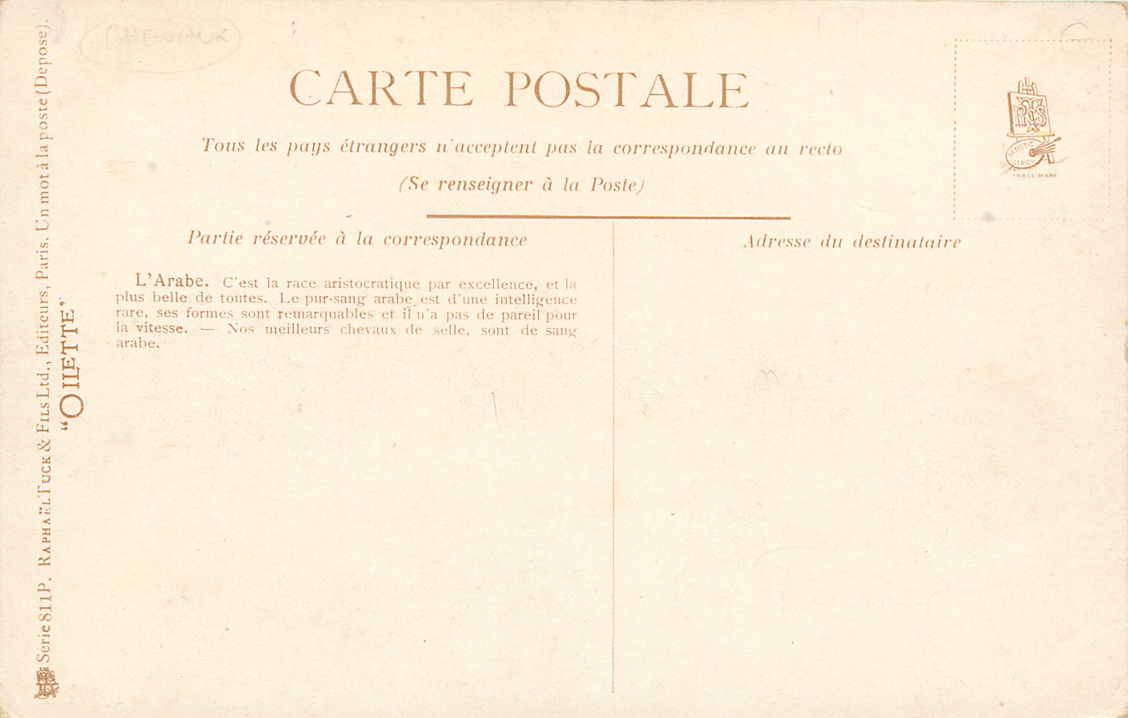OILETTE, UN MOT A LA POSTE (DEPOSE), suffix P, comes with CHOCOLAT H. WAUTERS, GAND advert. on back in black, same image English back OILETTE 9254 THE HORSE