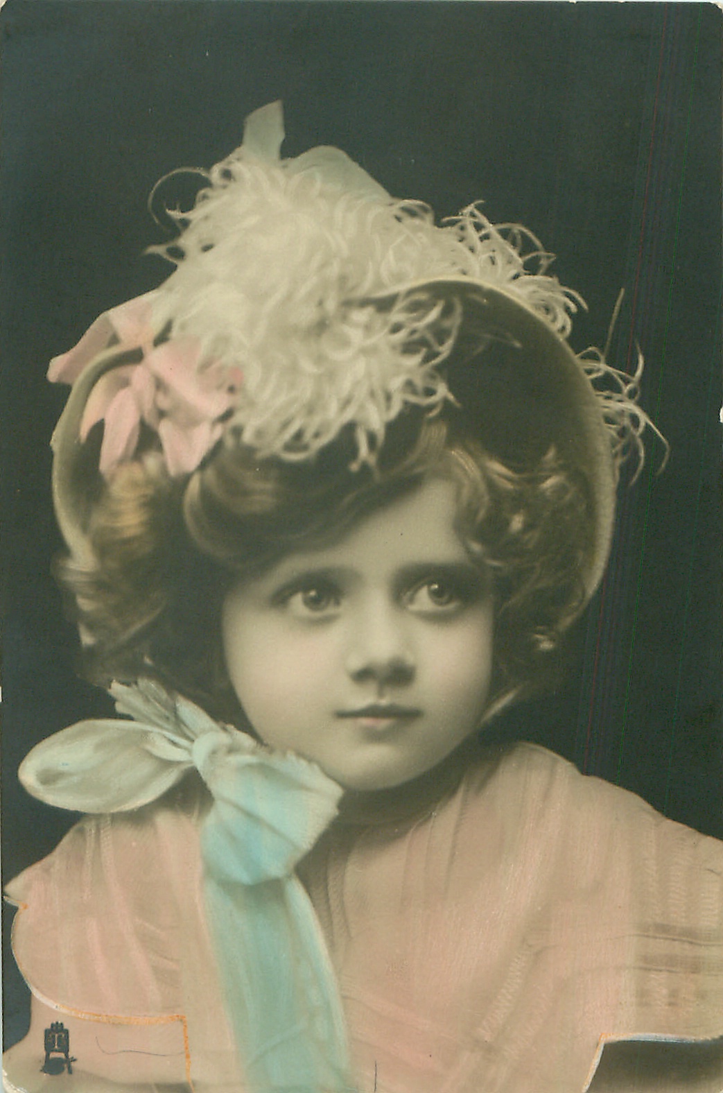 head & shoulders study of young girl, curly hair, hat with bow under chin