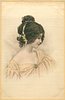 she has a metal ornament in hair, faces partly right & looks down