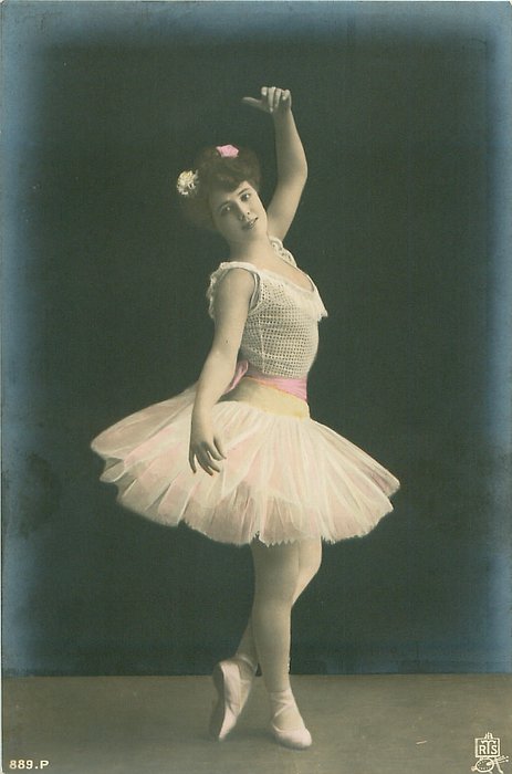 she poses with one hand raised above her head, the other lifting her skirt, faces right & looks front
