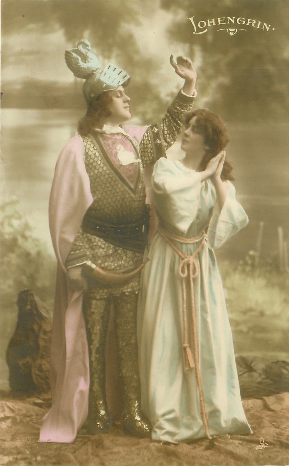 Lohengrin stands left, his eyes closed, left hand raised above lady standing in front of him looking at him, her palms held together