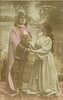 Lohengrin stands left, looking front, his right hand holds left hand of lady standing in front of him looking at him, her right hand on his waist
