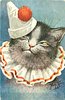 grey/white cat, frilly cloth collar, clowns hat, looks up & left