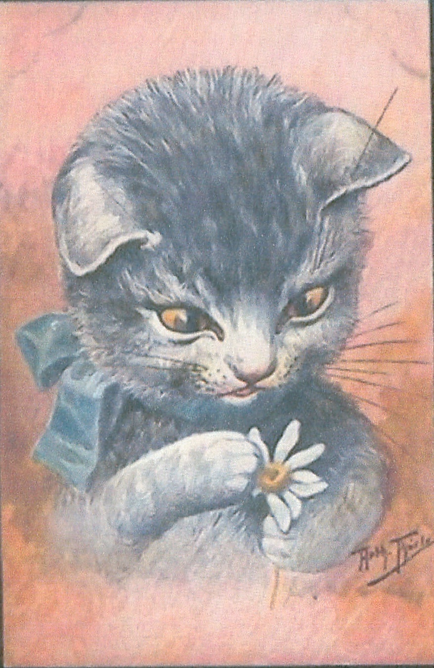 grey cat, blue cloth collar, plays the flower game with a daisy, looking down at flower