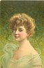head & shoulders study of beauty, off shoulder filmy light green dress, faces left, looks front