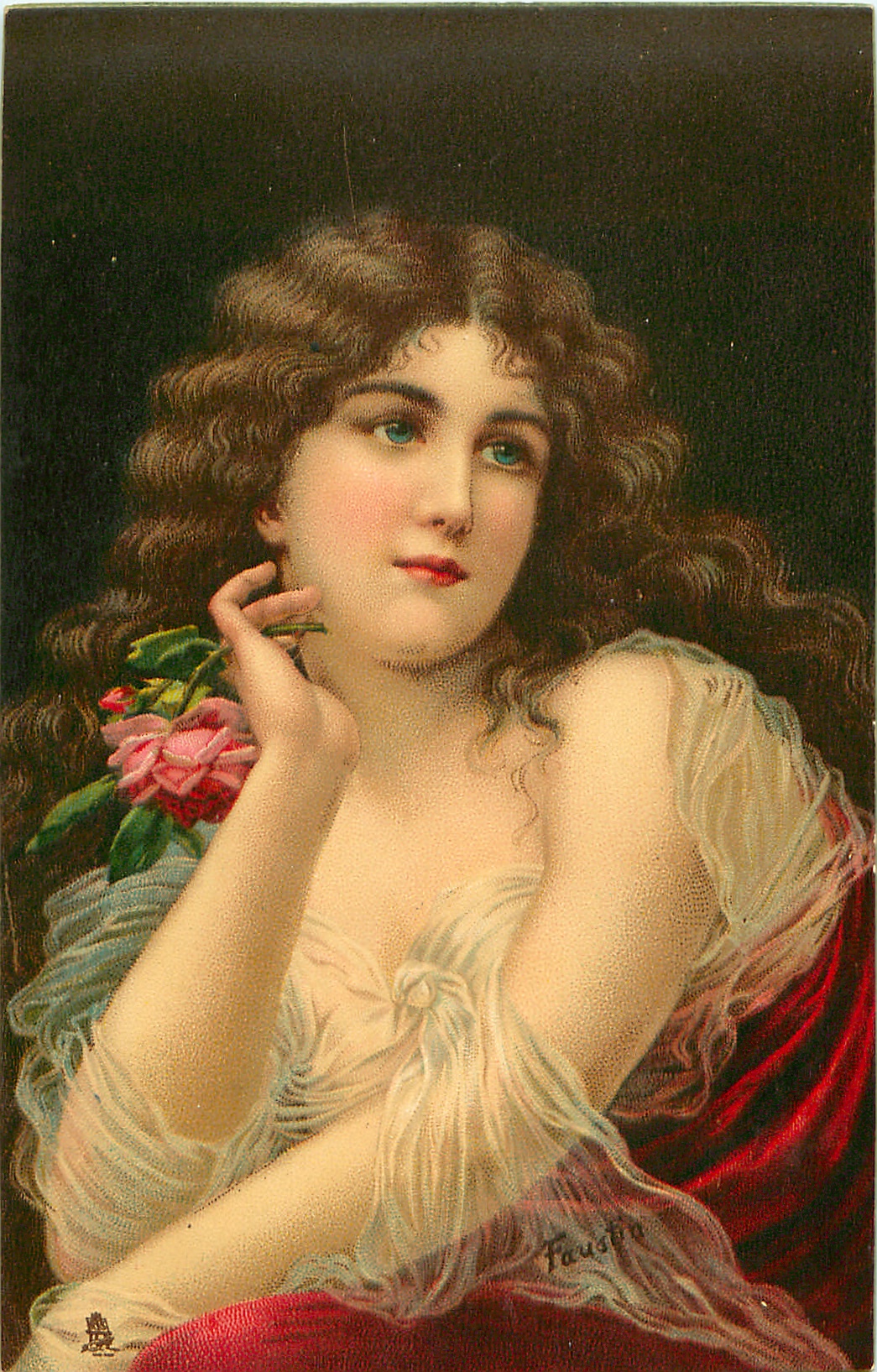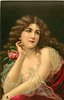 woman with long brown hair, flimsy wrap over red dress, red rose held near face, looking right/front