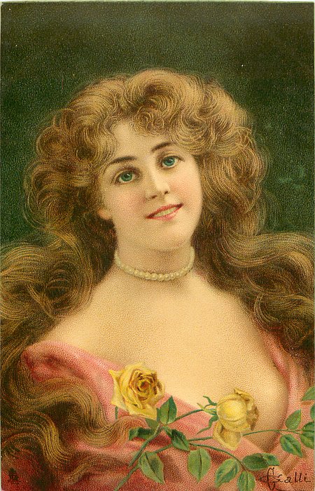 woman with pearl necklace, brown hair, pinkish dress, two yellow roses lower center, facing partly right, looking front