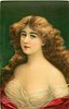 woman with long brown hair, very flimsy off shoulder wrap, red dress, facing partly left looking front