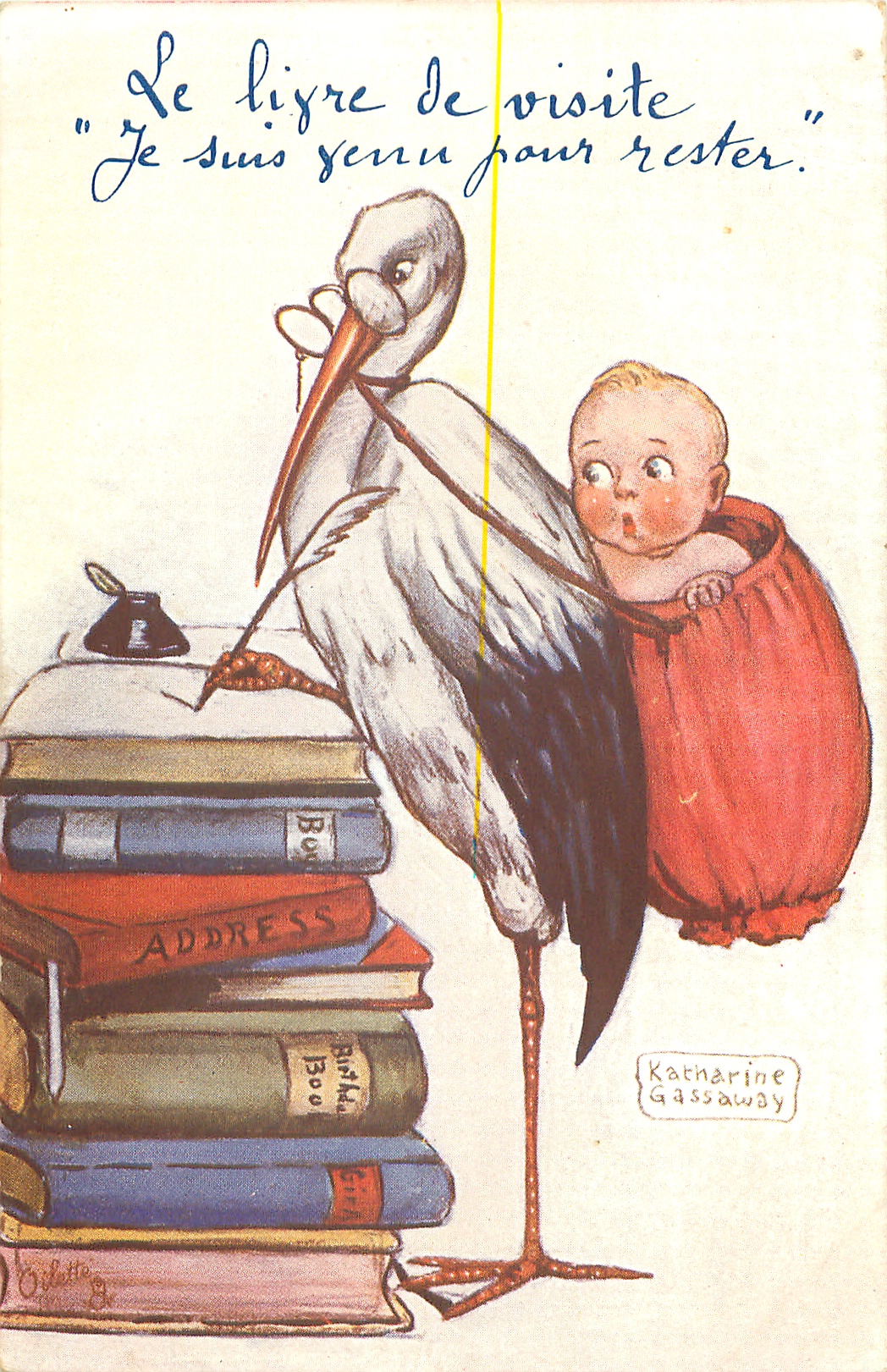 OILETTE, UN MOT A LA POSTE (DEPOSE), suffix P, same images, English back OILETTE 2495 THE NEW BABY, German backs & inscriptions OILETTE 483B DAS NEUE BABY