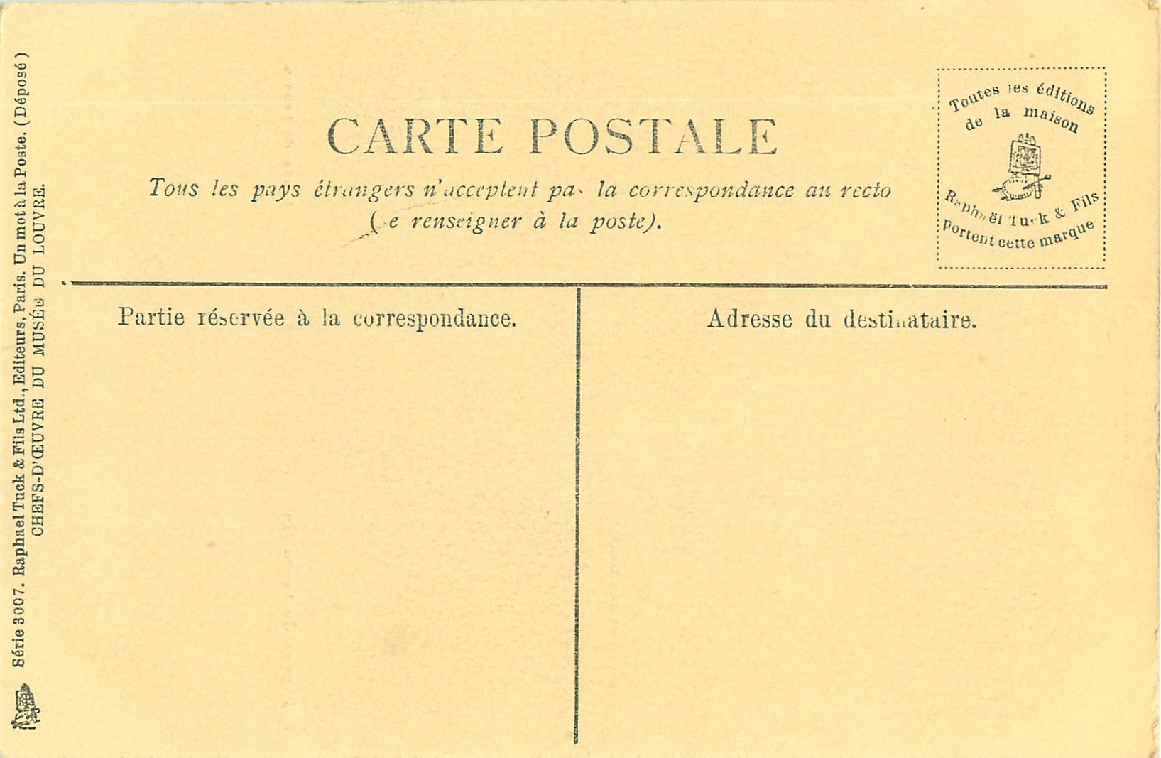 brown/purple,UN MOT A LA POSTE, (DEPOSE), same image & number, German/International back 3007 COLLECTION ALTER MEISTER AUS DEN FRANZOSISCHEN GALERIEN with inscription,front title & artist in French
