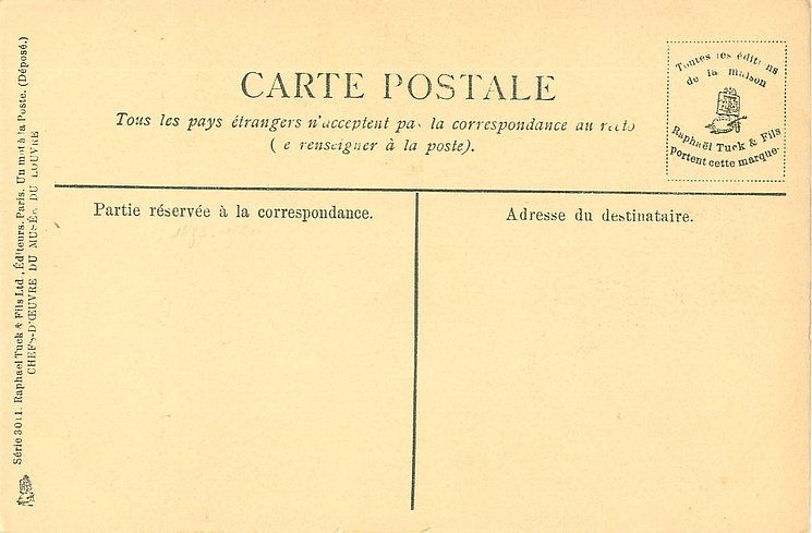 brown/purple,UN MOT A LA POSTE, (DEPOSE), same image & number, German/International back 30I1 COLLECTION ALTER MEISTER AUS DEN FRANZOSISCHEN GALERIEN with inscription,front title & artist in French