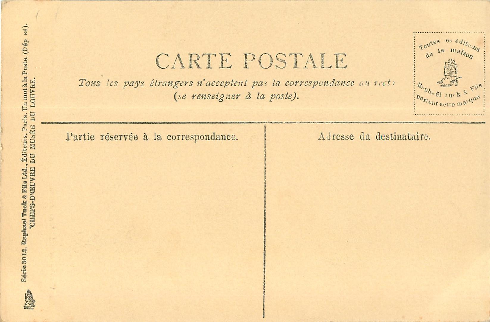 brown/purple,UN MOT A LA POSTE, (DEPOSE), same image & number, German/International back 3013 COLLECTION ALTER MEISTER AUS DEN FRANZOSISCHEN GALERIEN with inscription,front title & artist in French