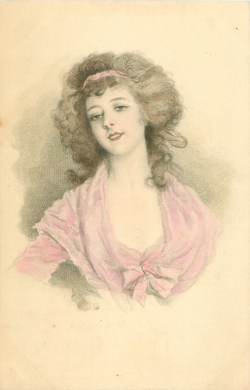 girl in pink dress, deep cleavage, with brown curly hair, faces & looks front