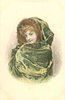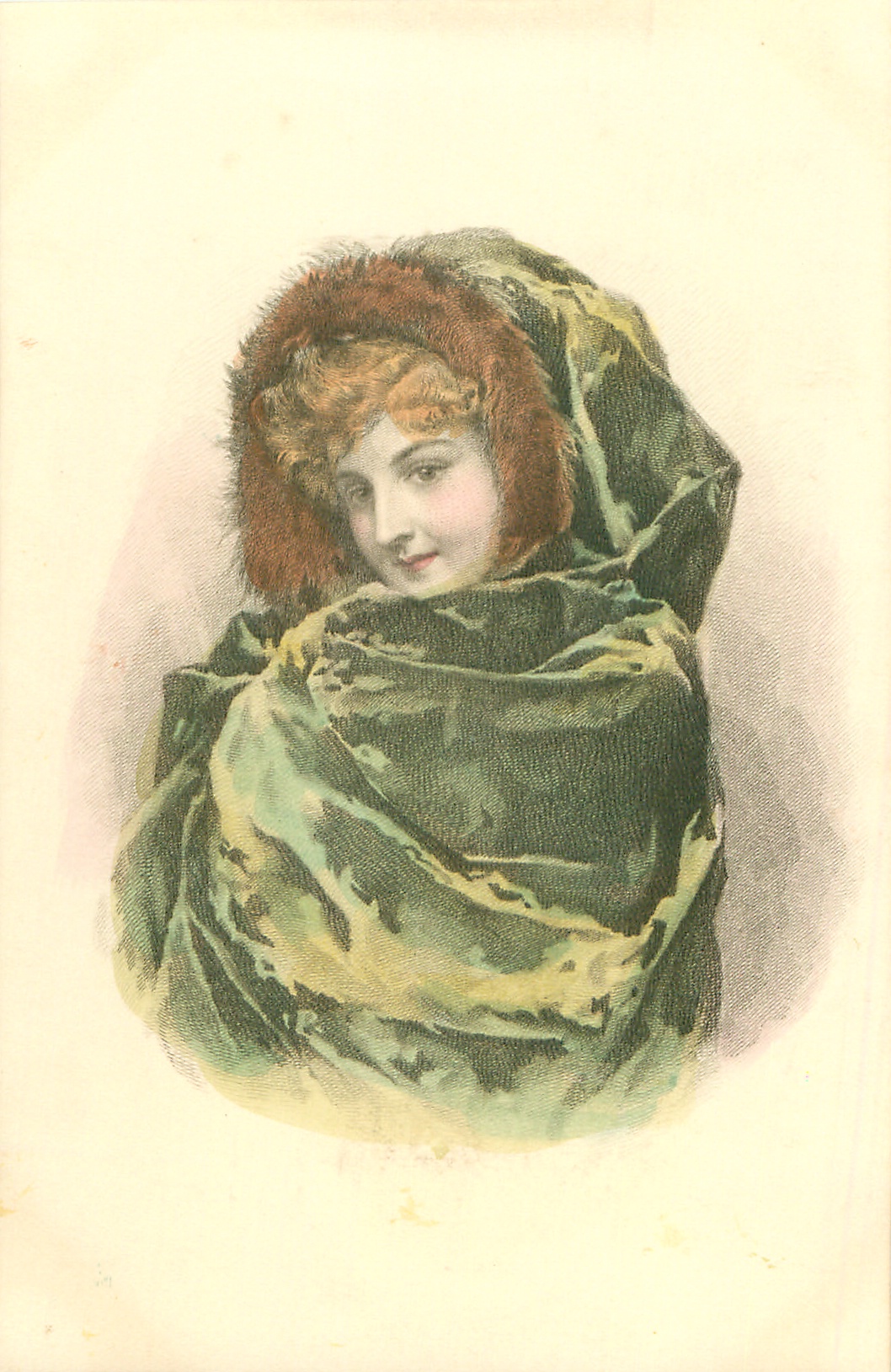 girl wrapped in green cloak, headpiece trimmed with brown fur, faces left, looks front