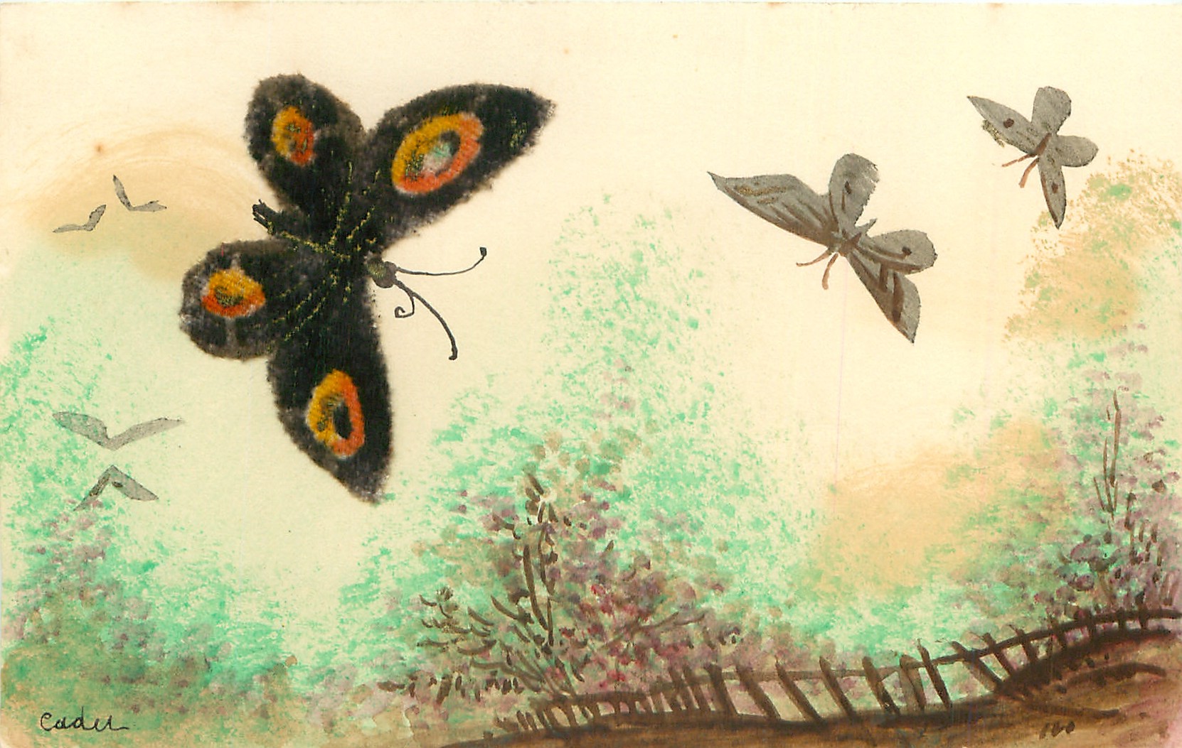 felt applique butterfly left & others painted over rural scene, fence below