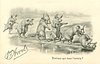 six pigs move right in line on their hind legs, next to water, one in front has fallen