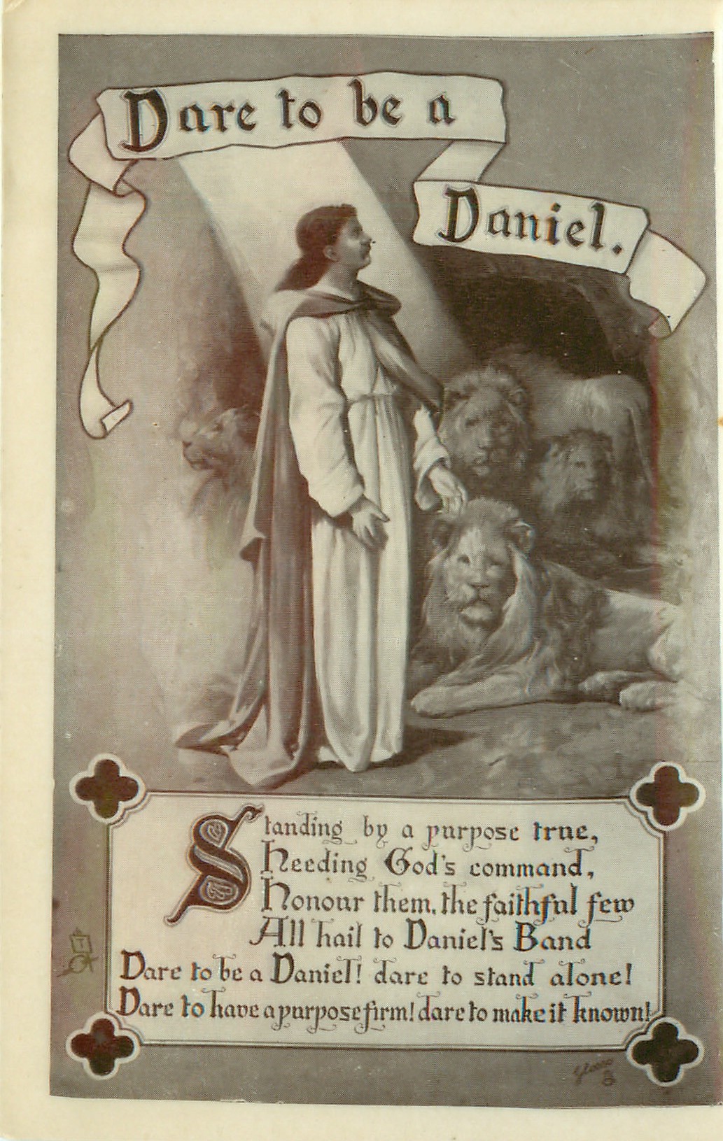 verse:- STANDING BY A PURPOSE TRUE, HEEDING GOD'S COMMAND, HONOUR THEM, THE FAITHFUL FEW ALL HAIL TO DANIELS BAND DARE TO BE DANIEL! DARE TO STAND ALONE! DARE TO HAVE A PURPOSE FIRM! DARE TO MAKE IT KNOWN!