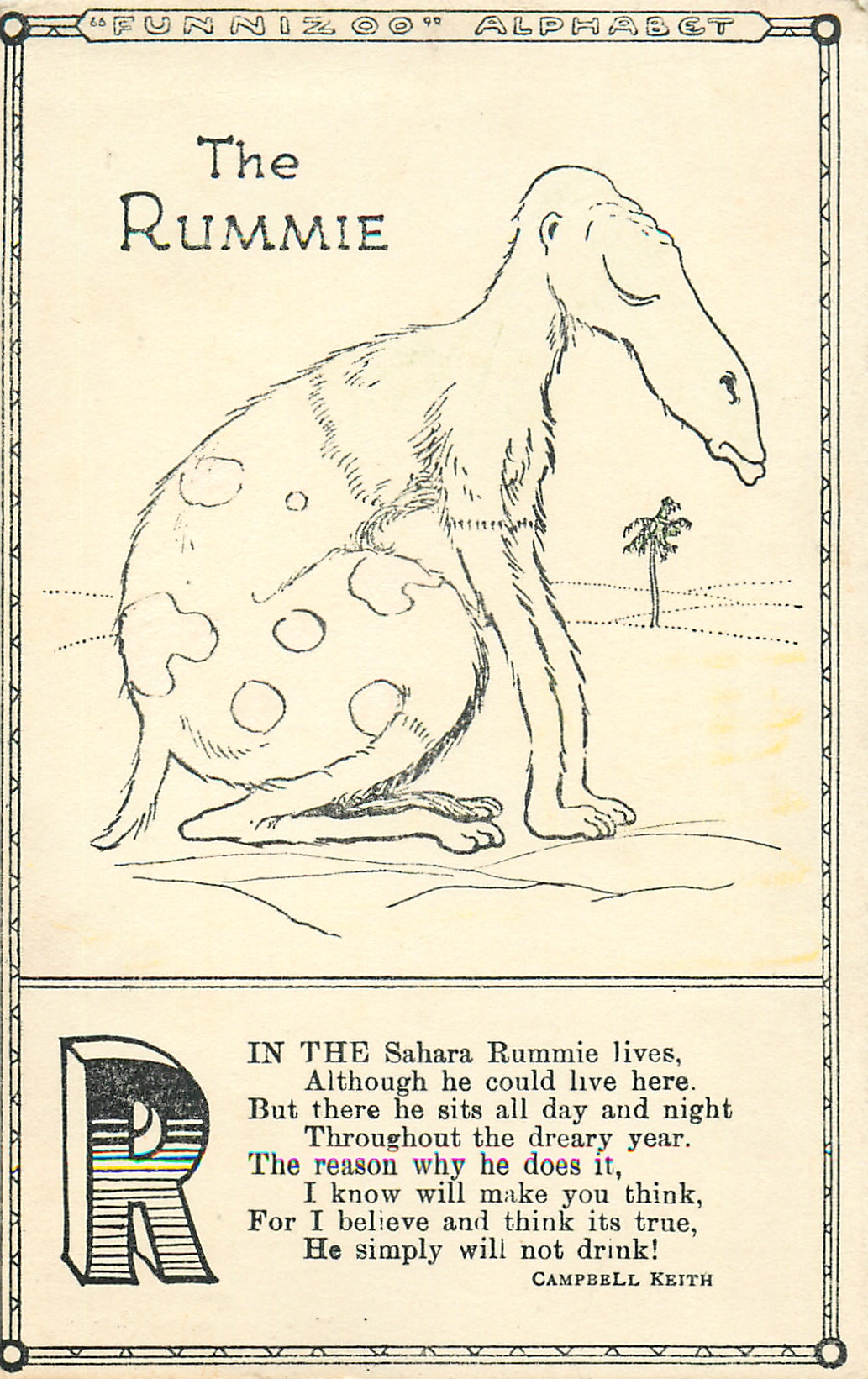 verse:- IN THE SAHARA RUMMIE LIVES, ALTHOUGH HE COULD LIVE HERE. BUT THERE HE SITS ALL DAY AND NIGHT THROUGHOUT THE DREARY YEAR. THE REASON WHY HE DOES IT, I KNOW WILL MAKE YOU THINK, FOR I BELIEVE AND THINK ITS TRUE, HE SIMPLY WILL NOT DRINK! quote CAMPBELL KEITH