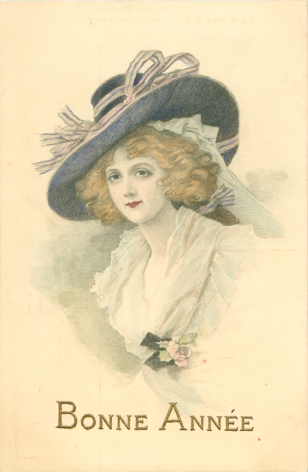 half length study of elegantly dressed girl in wide-brimmed hat, filmy dress with rose corsage, faces partly left, looks front
