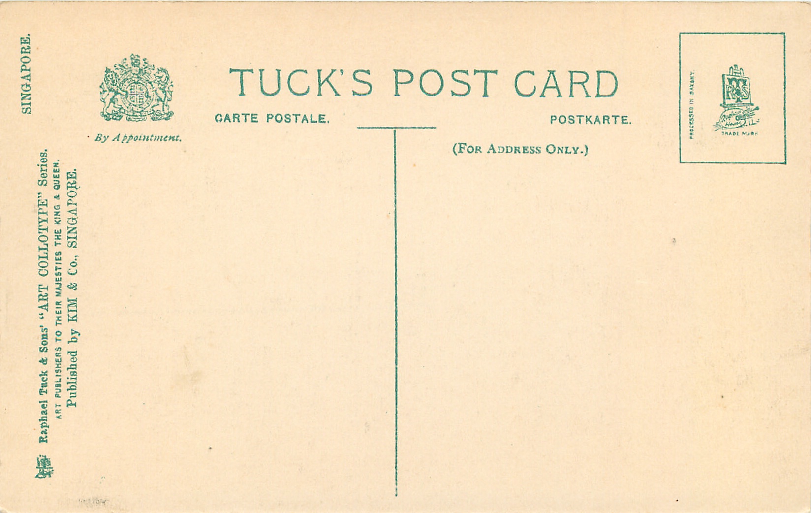 grey, green backs, ART COLLOTYPE, PUBLISHED BY KIM & CO., SINGAPORE, PROCESSED IN SAXONY (in stamp box), shades of grey/black