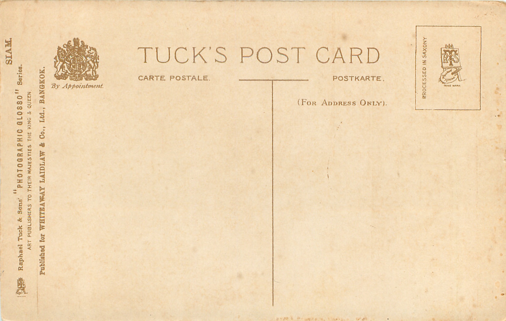 shades of grey/black, PHOTOGRAPHIC GLOSSO, PROCESSED IN SAXONY (in stamp box), PUBLISHED FOR WHITEAWAY LAIDLAW & CO., LTD., BANGKOK, many of the same images COLLO-PHOTO 893,