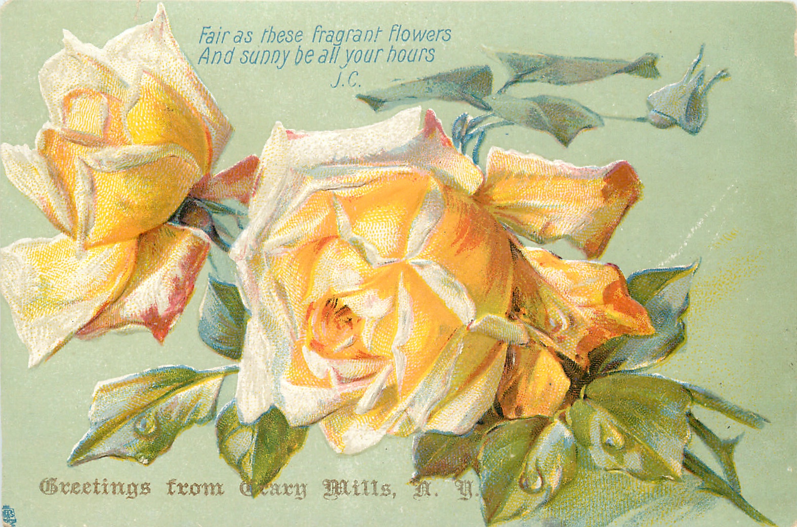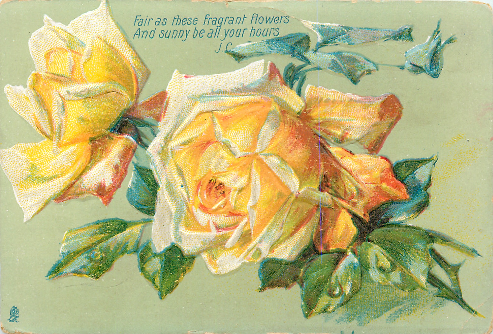 FAIR AS THESE FRAGRANT FLOWERS AND SUNNY BE ALL YOUR HOURS YOUR HOURS two yellow roses