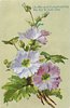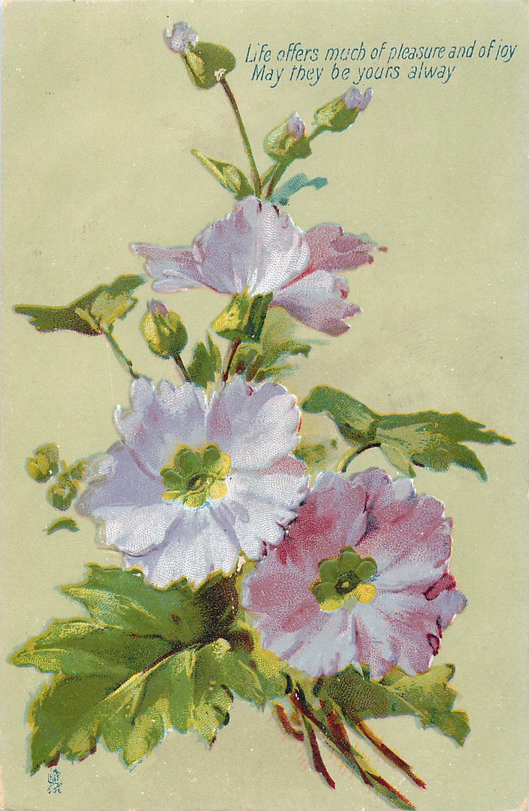 LIFE OFFERS MUCH OF PLEASURE AND OF JOY MAY THEY BE YOURS ALWAYS pink flowered mallow with one purple flower lower right