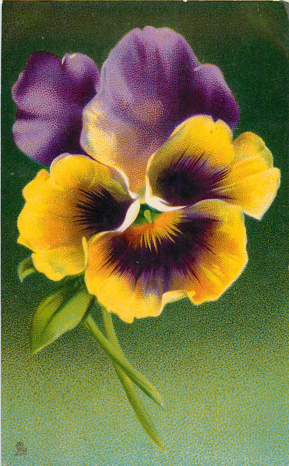 purple and yellow pansy, two stems to lower center, one full leaf visable, another partial leaf above, green background