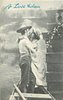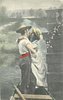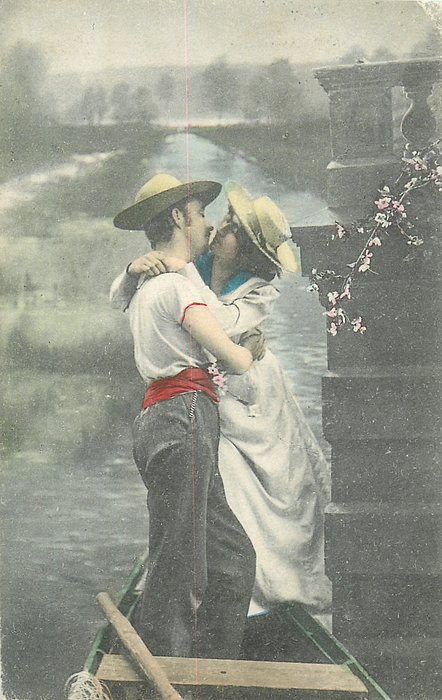 man standing at back of boat embraces woman partly on dock, they almost kiss