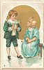 boy stands with dance card, left, and girl sits on bench,right, gilt circle behind