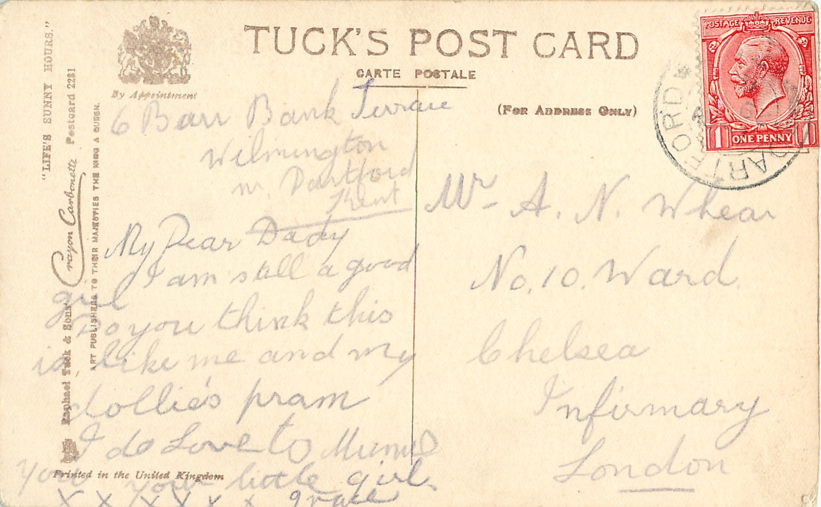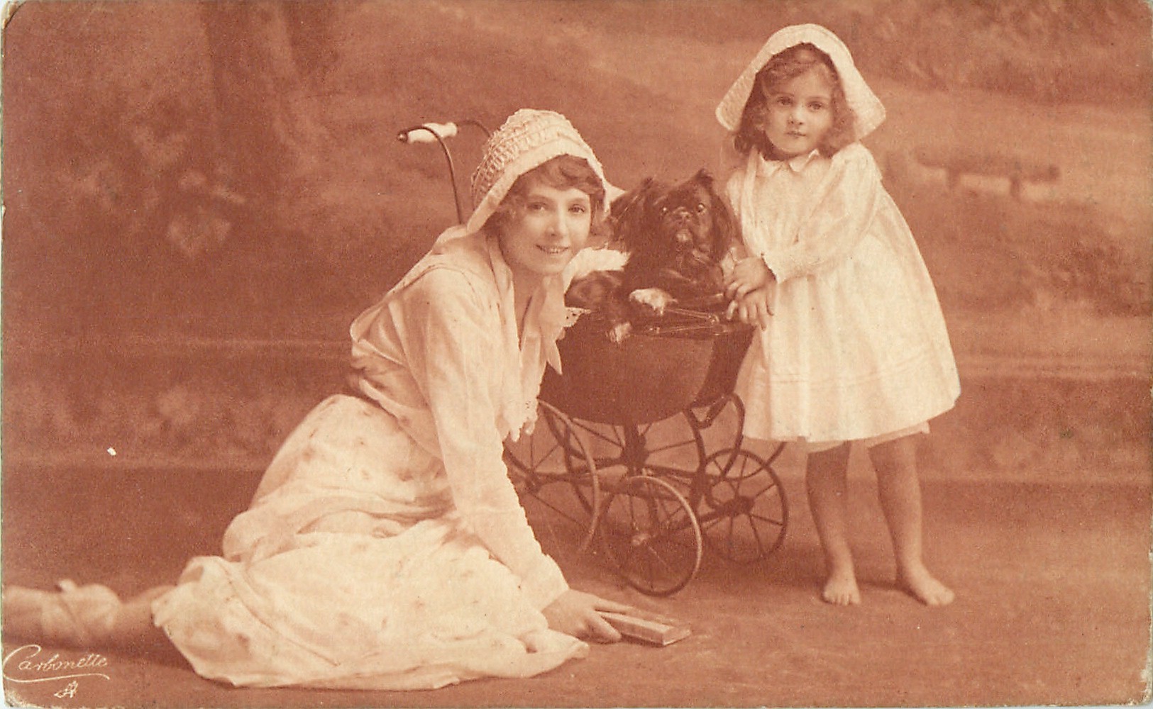 girl stands to right of pekingese in pram, mother sits on ground front left