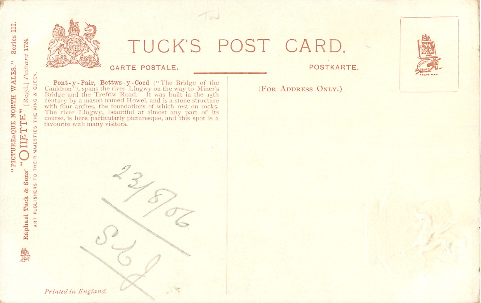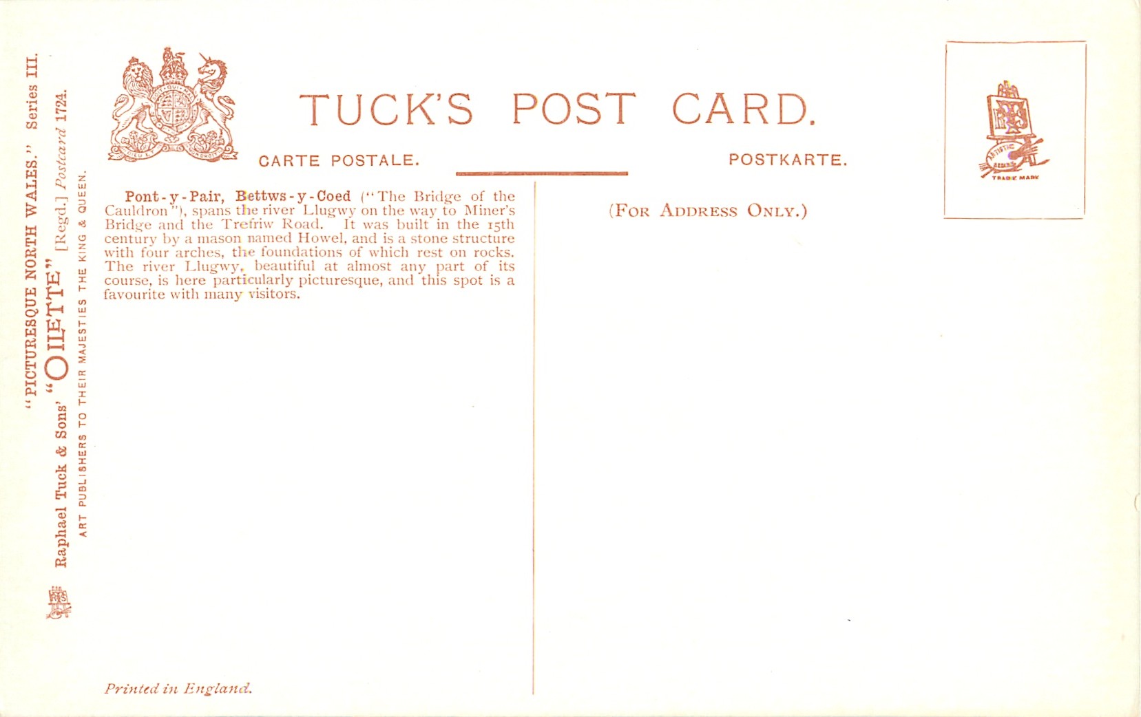 OILETTE, 4 backs, PRINTED IN ENGLAND, come with or w/o OILETTE on front, on pkt. AFTER THE BLACK AND WHITE DRAWINGS BY F.W. HAYES, come opt. in gilt with crest & ARMS OF WALES, listed in 1904 & 1908/1909 POSTCARD Catalogue