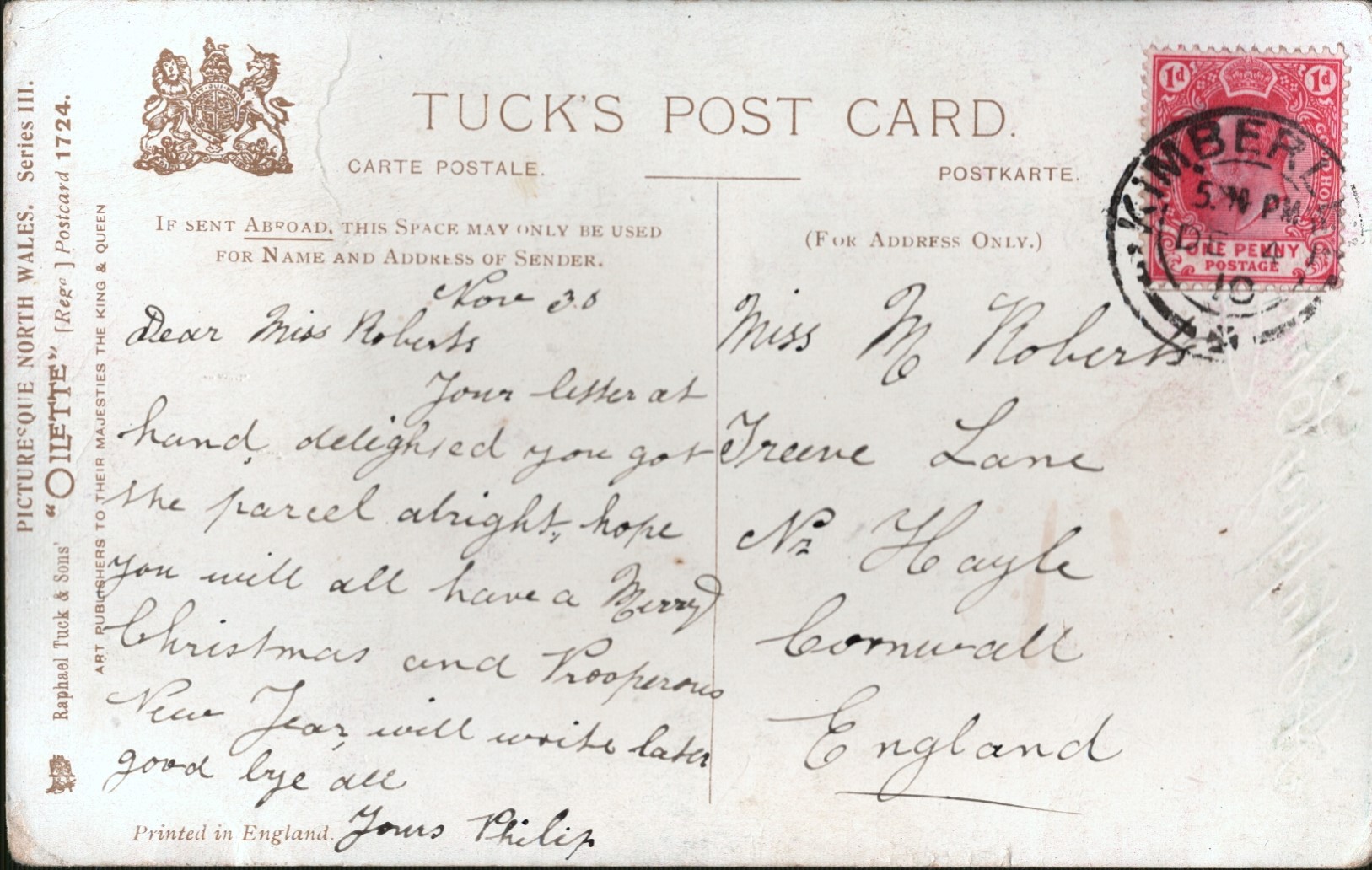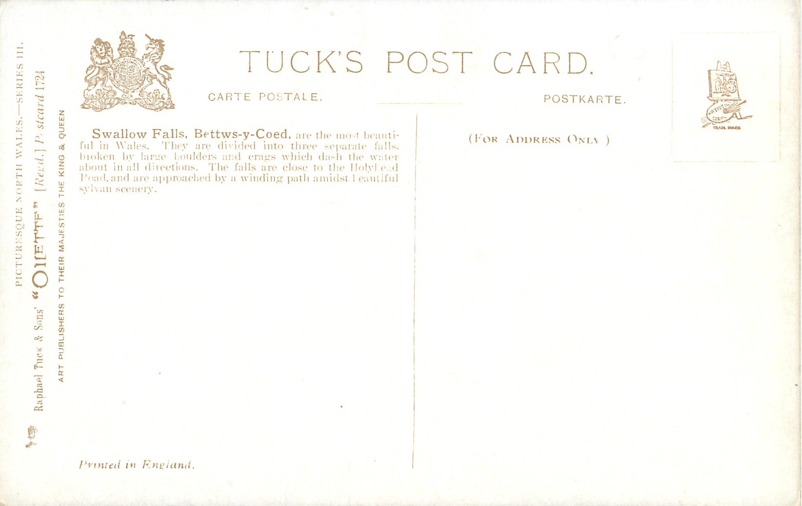 OILETTE, 4 backs, PRINTED IN ENGLAND, come with or w/o OILETTE on front, on pkt. AFTER THE BLACK AND WHITE DRAWINGS BY F.W. HAYES, come opt. in gilt with crest & ARMS OF WALES, listed in 1904 & 1908/1909 POSTCARD Catalogue