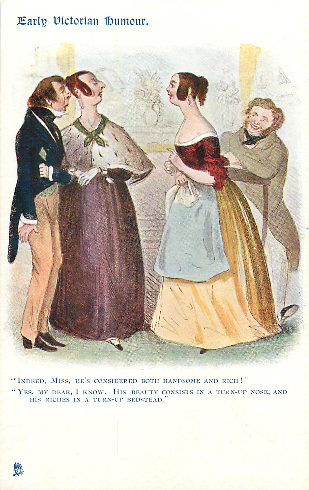 "INDEED, MISS, HE'S CONSIDERED BOTH HANDSOME AND RICH!", "YES, MY DEAR, I KNOW. HIS BEAUTY CONSISTS IN A TURN-UP NOSE, AND HIS RICHES IN A TURN-UP BEDSTEAD."