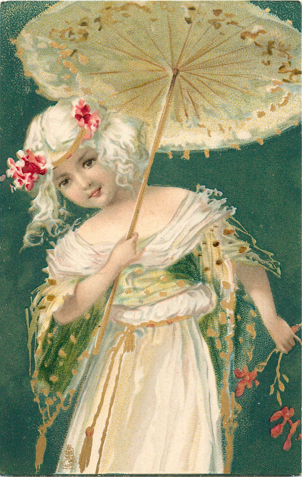 pretty girl with flowers in band on her head, holds parasol in her right hand, flowers in her left