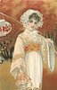 pretty girl in white holds fan in right hand, holds bowl lamp on stick over her left shoulder