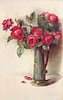 eight red opened roses in tall vase with handle and medallion on front