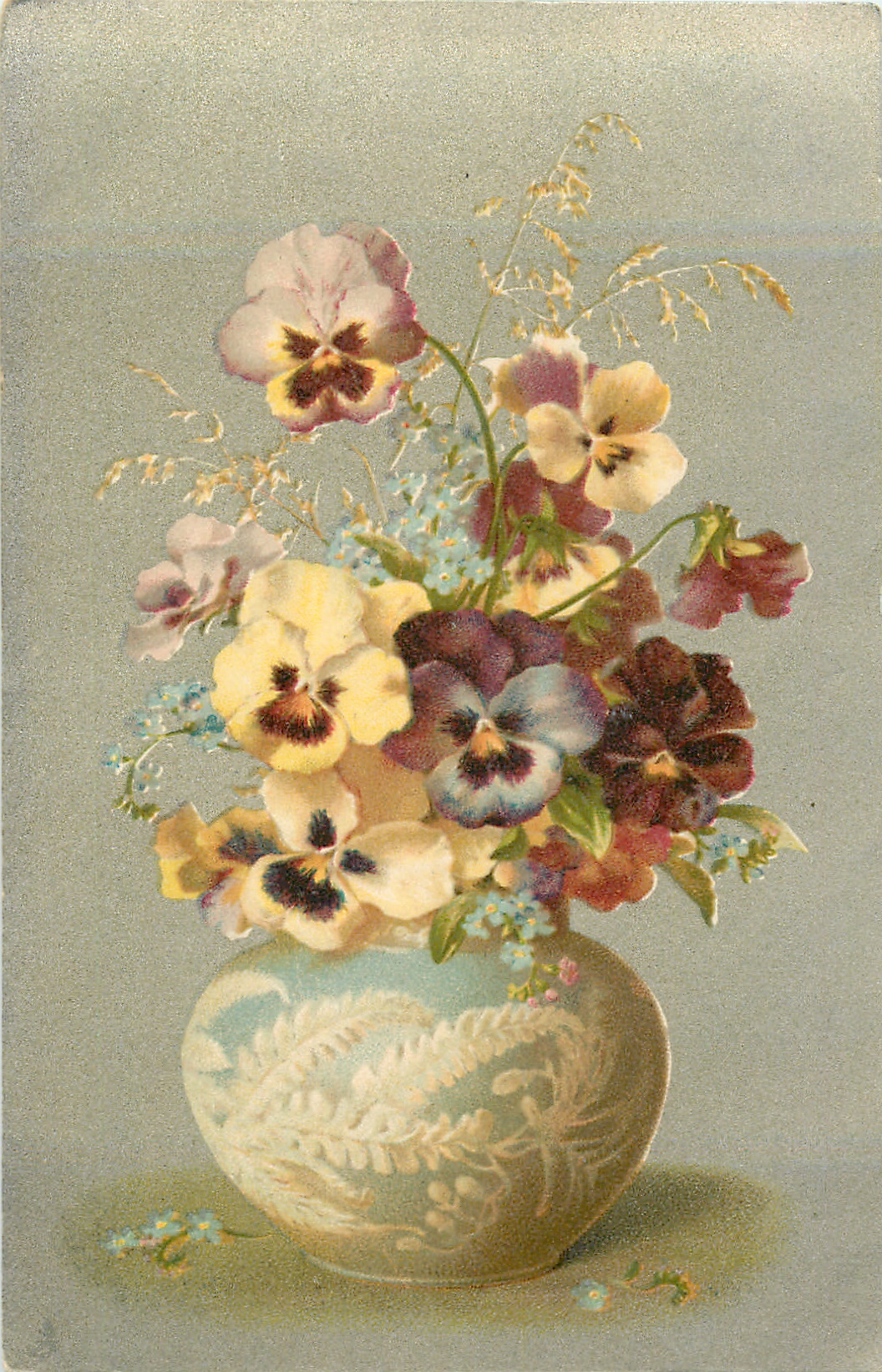 white/blue vase center with pansies & forget-me-nots
