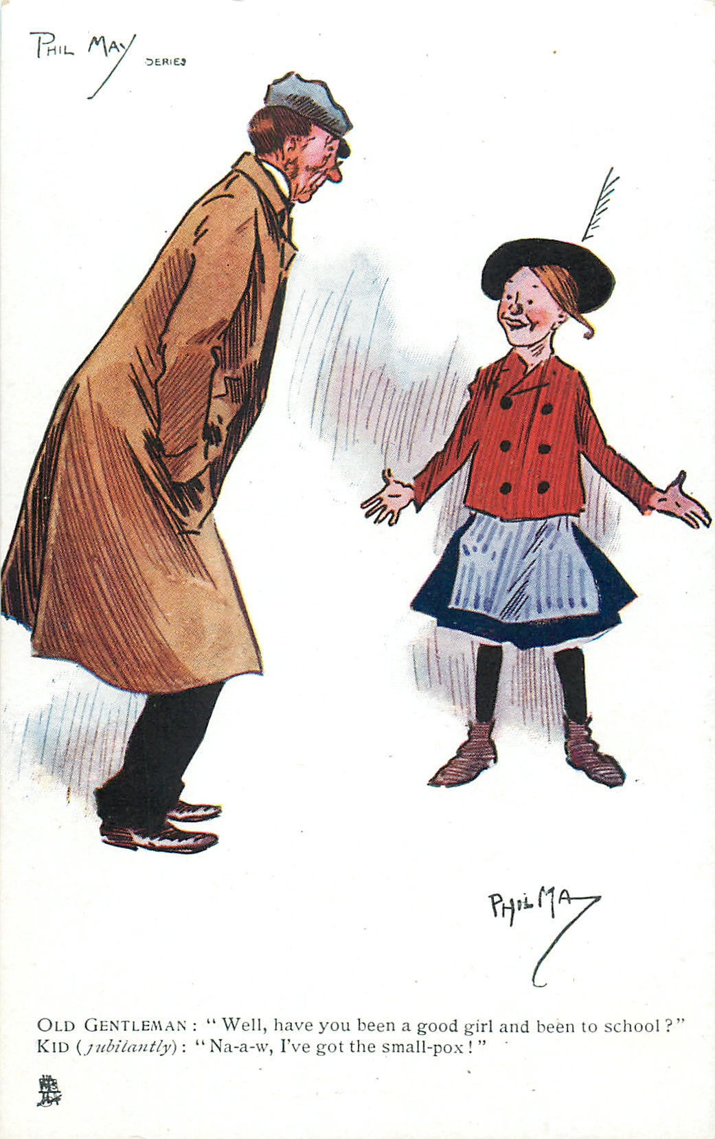 OLD GENTLEMAN: "WELL, HAVE YOU BEEN A GOOD GIRL AND BEEN TO SCHOO?" KID (JUBILANTLY): "NA-A-W, I'VE GOT THE SMALL-POX!"