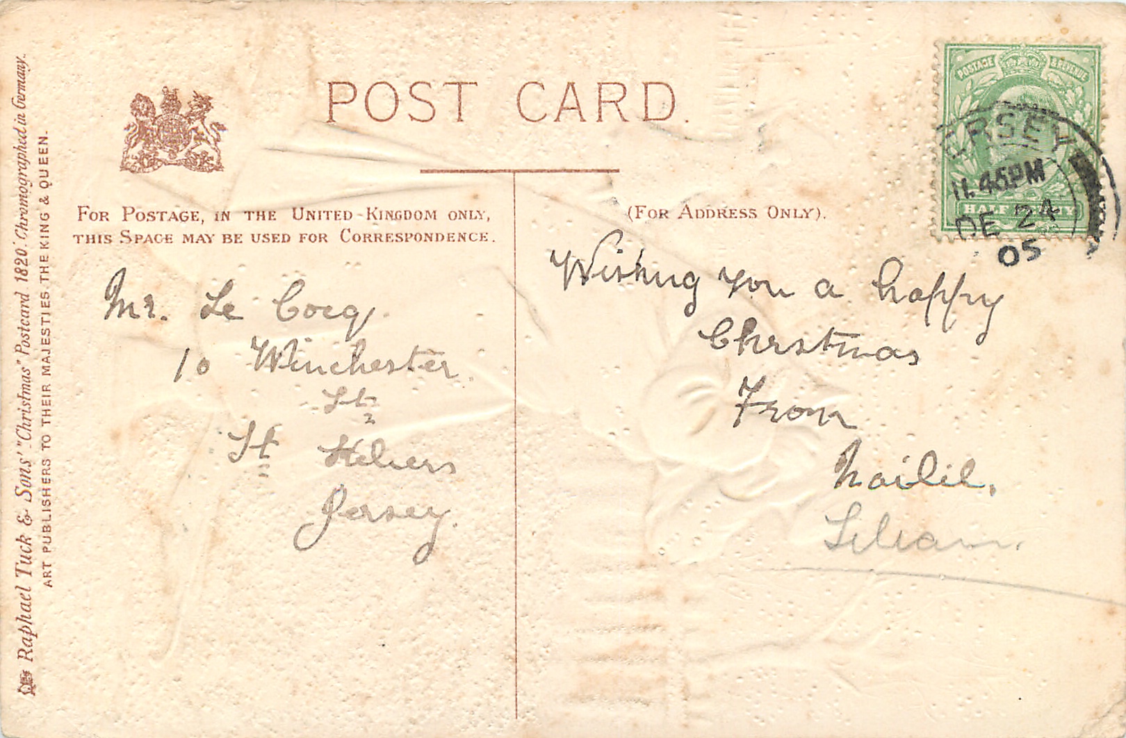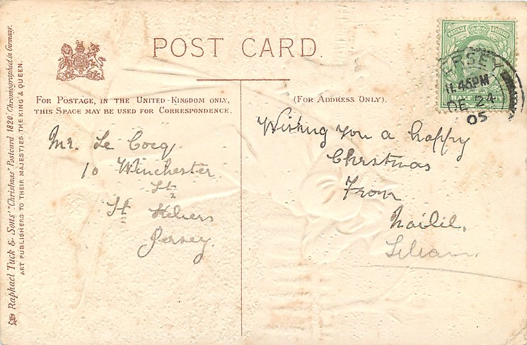 embossed, CHROMOGRAPHED IN GERMANY, come glittered, listed in RAPHAEL TUCK & SONS' LD. CHRISTMAS & NEW YEAR 1904/1905 catalogue