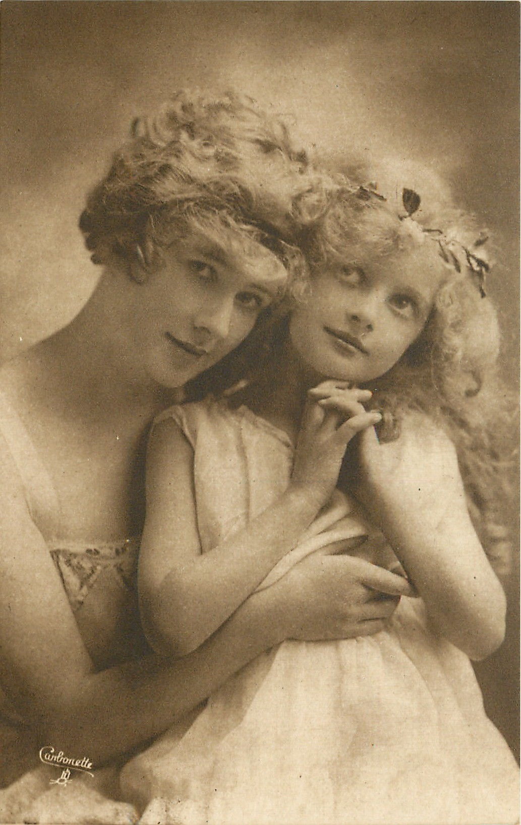 mother holds child in arms, mother to left, heads touch, girl's hands together under chin, mother's left arm not visible